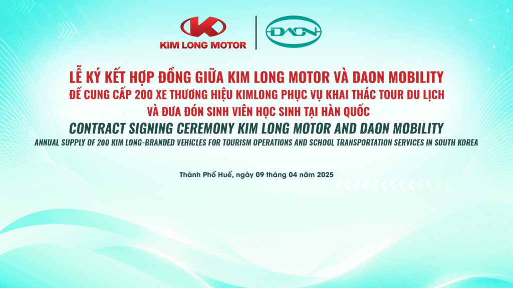 Công ty KIM LONG MOTOR HUẾ Công ty DAON Mobility (Hàn Quốc) chính thức Ký kết Hợp đồng Mua Bán, theo đó KIM LONG MOTOR sẽ cung cấp 200 Xe Buýt các loại thương hiệu KIM LONG để xuất khẩu sang Hàn Quốc nhằm phục vụ cho hoạt động khai thác tour du lịch và đưa đón sinh viên học sinh tại Hàn Quốc. Hợp đồng này đánh dấu bước tiến quan trọng trong chiến lược mở rộng thị trường quốc tế của KIM LONG MOTOR, đồng thời khẳng định năng lực sản xuất và chất lượng vượt trội của sản phẩm thương hiệu KIM LONG, góp phần đưa các sản phẩm ô tô “Made in Vietnam” ghi dấu trên bản đồ ngành công nghiệp ô tô thế giới.