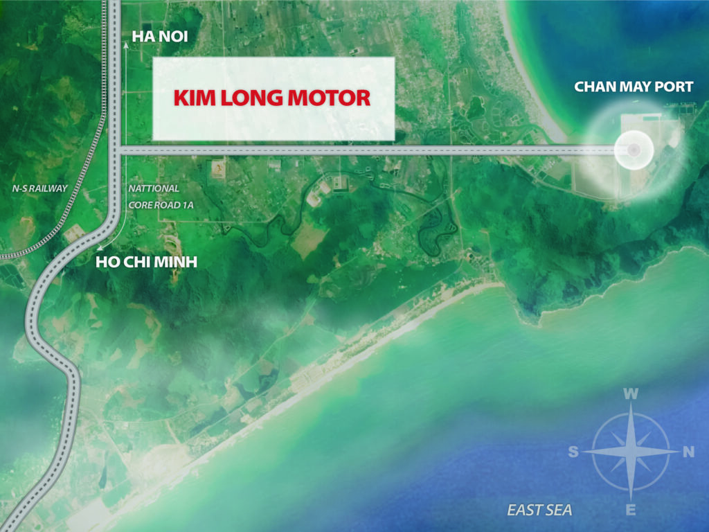 位于越南中部经济重点区域 珍美- 凌姑经济区,KIM LONG Motors 汽车组装生产与配套厂园区占据了战略位置,北与东濒东海,南靠岘港市。陆路、铁路、航空、水路交通均便利: